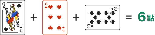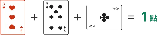 不管是拿到兩張牌還是三張牌,只要把點數相加再一起,該總和數字的個位數就是你的得分,每一場遊戲中,只會有0-9點的情況出現,點數較大那方就會是贏家,雙方點數一樣就成為和局。